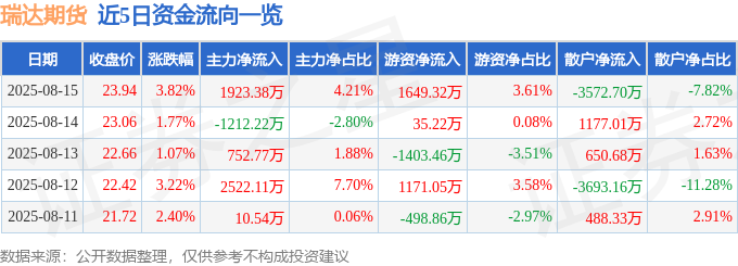 本站消息,截至2025年8月15日收盘,瑞达期货(002961)报收于23.94元,上涨3.82%,换手率4.32%,成交量19.24万手,成交额4.57亿元。